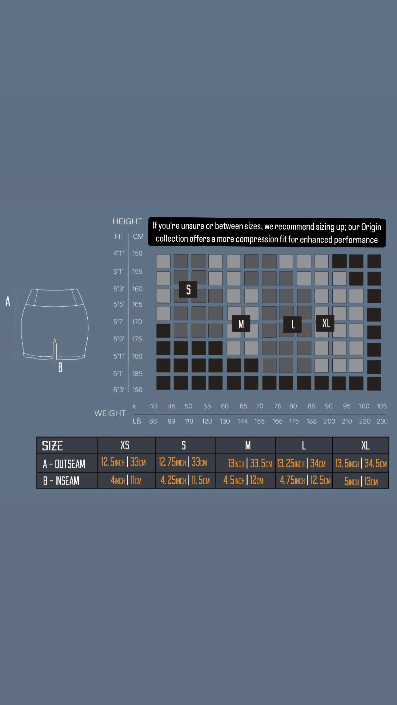 If you're unsure or between sizes, we recommend sizing up; our Origin Collection offers a more compression fit for enhanced performance